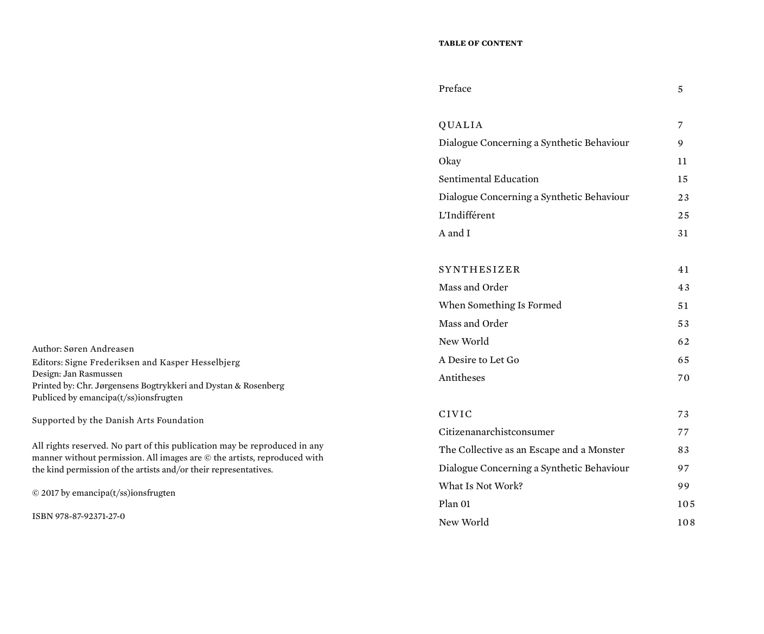 Redigeret: Signe Frederiksen og Kasper Hesselbjerg. Grafisk formgivning: Jan Rasmussen. Omfang: 108 sider. Format: 12x20 cm. Oplag: 1000 ex. Indbinding: Garnhæftet, softcover. Tryk: Chr. Jørgensens Bogtrykkeri og Dystan Rosenberg. 2017. ISBN: 978-87-92371-27-0. Pris: 125 DKK