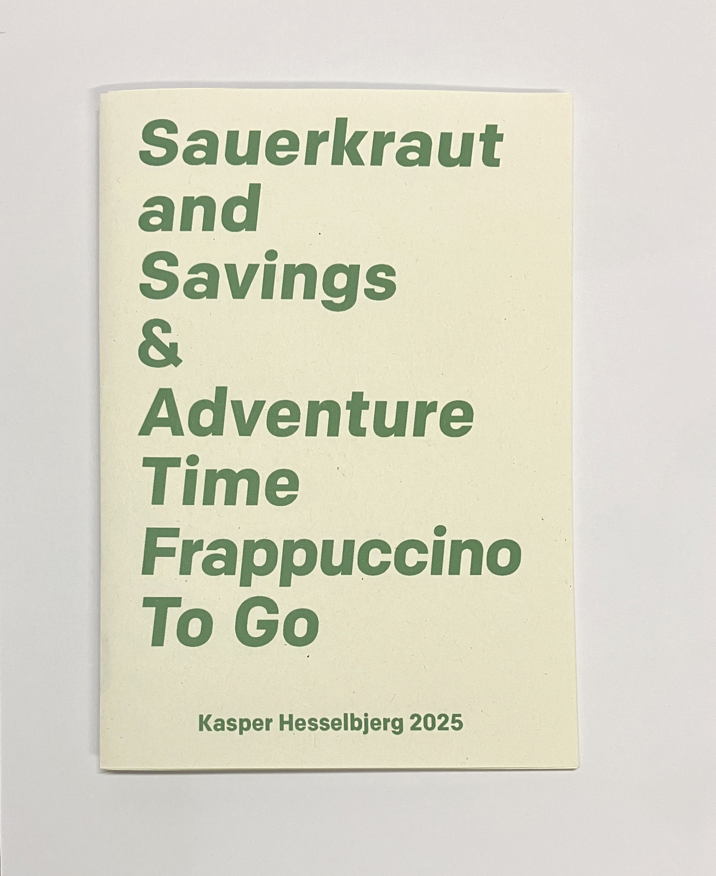Sauerkraut and Savings & Adventure Time Frappuccino To Go. Omfang: 20 sider. Format: 11,5 x 16,7 cm. Oplag: 100 ex. Indbinding: Hæftet med smudsomslag. Tryk: København. 2025. ISBN: 978-87-92371-45-4. Pris: 50 DKK